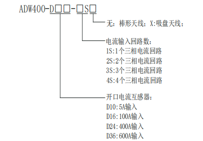 安科瑞 鲍静君 1概述 ADW400 环保监测模块主要用于计量低压网络的三相有功电能,同时可选择最大四个回路的电流输入,具RS485 通讯和 470MHz 无线通讯功能,方便用户进行用电监测、集抄和管理。可灵活安装于配电箱内,实现对不同区域和不同负荷的分项电能计量,统计和分析。 2 产品型号规格 2.1 ADW400 环保监测模块命名规则